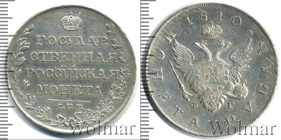 Коронованный двуглавый орел со скипетром и державой занимают центральную часть серебряного диска. На груди птицы выгравирован герб Московского княжества. Под геральдикой Российской Империи указано «ФГ» - инициалы минцмейстера Федора Гельмана. В верхнем полукруге вдоль края радиально написан номинал «МОНЕТА РУБЛЬ», в нижнем – год эмиссии «1810».