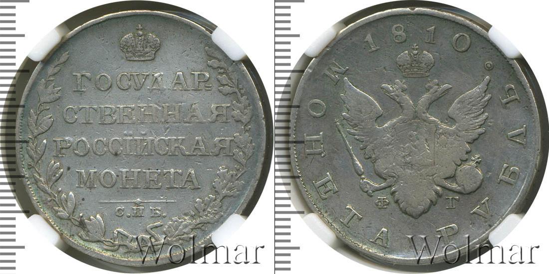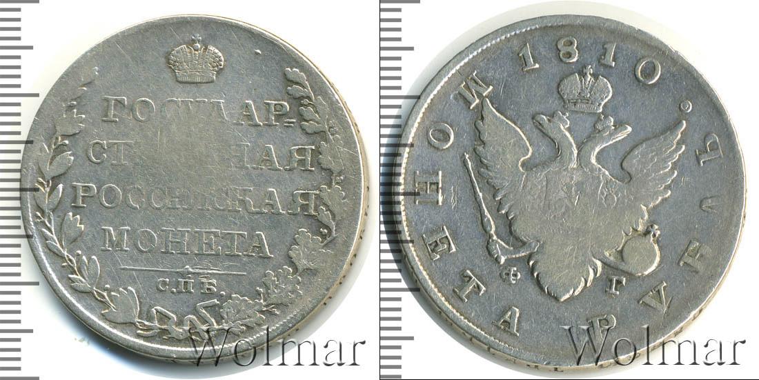 Коронованный двуглавый орел со скипетром и державой занимают центральную часть серебряного диска. На груди птицы выгравирован герб Московского княжества. Под геральдикой Российской Империи указано «ФГ» - инициалы минцмейстера Федора Гельмана. В верхнем полукруге вдоль края радиально написан номинал «МОНЕТА РУБЛЬ», в нижнем – год эмиссии «1810».