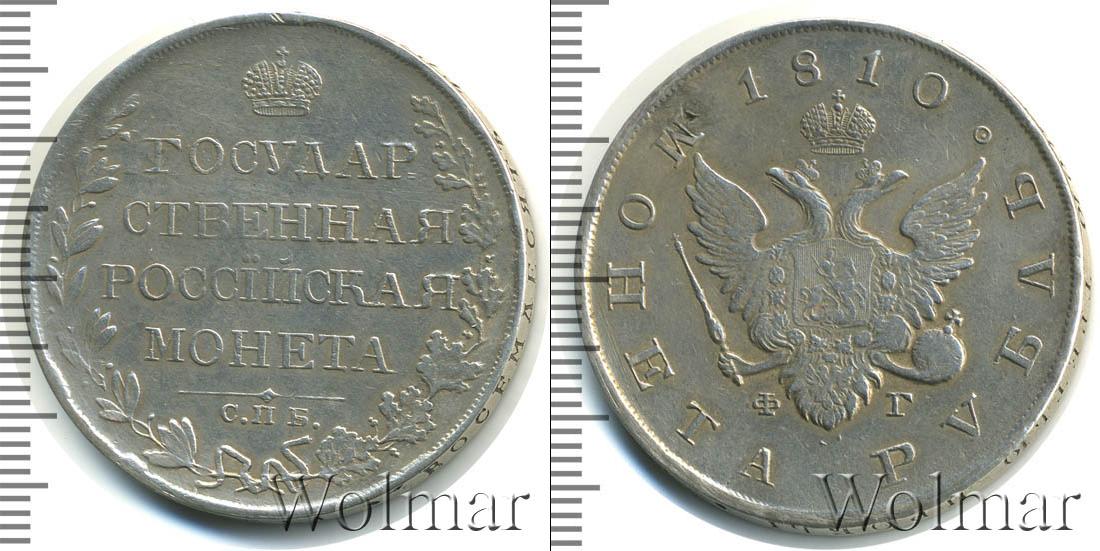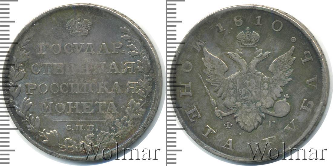 Коронованный двуглавый орел со скипетром и державой занимают центральную часть серебряного диска. На груди птицы выгравирован герб Московского княжества. Под геральдикой Российской Империи указано «ФГ» - инициалы минцмейстера Федора Гельмана. В верхнем полукруге вдоль края радиально написан номинал «МОНЕТА РУБЛЬ», в нижнем – год эмиссии «1810».