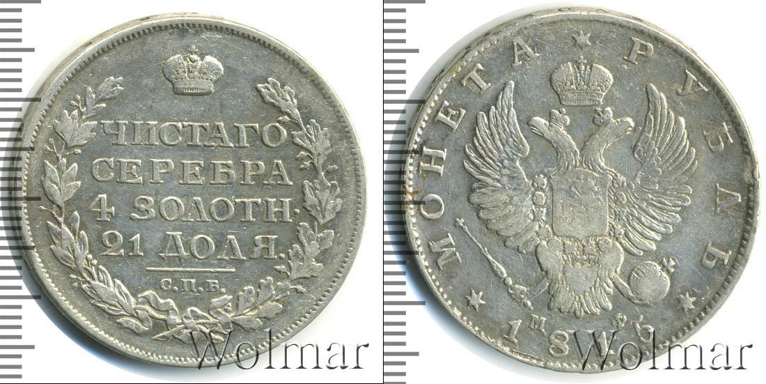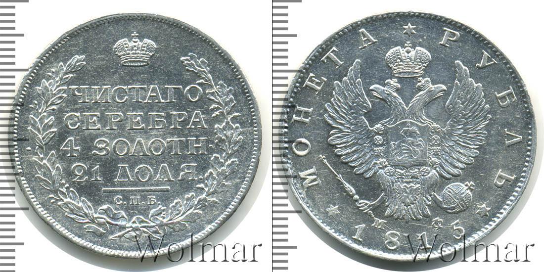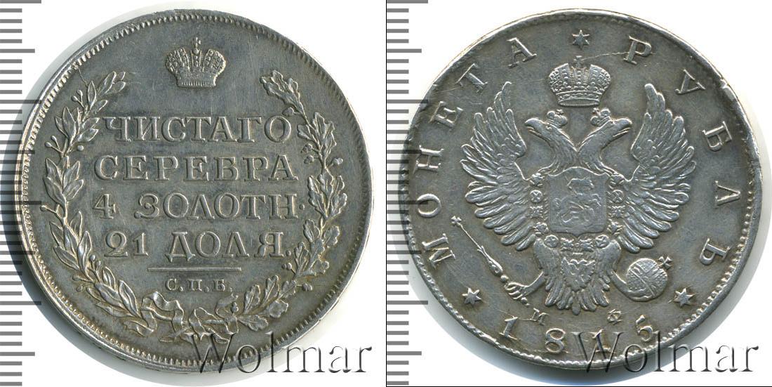 Круговая надпись вдоль канта с зубчатым узором означает номинал и год эмиссии «МОНЕТА * РУБЛЬ * 1815». Центральным элементом украшения серебряного диска является герб Российской Империи. На груди коронованного двуглавого орла выгравирована геральдика Московского княжества с Георгием Победоносцем. Возле хвоста птицы указаны инициалы минцмейстера «МФ».