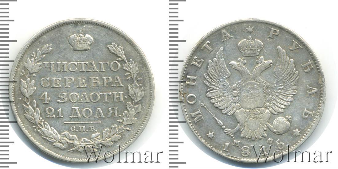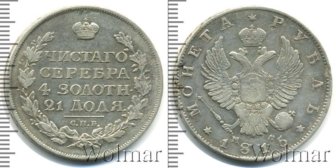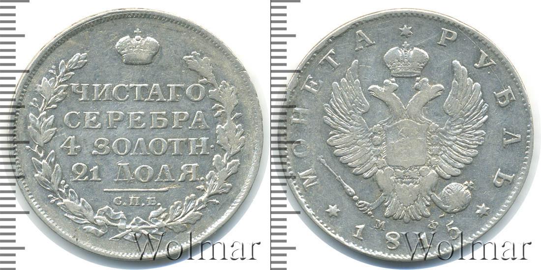 Круговая надпись вдоль канта с зубчатым узором означает номинал и год эмиссии «МОНЕТА * РУБЛЬ * 1815». Центральным элементом украшения серебряного диска является герб Российской Империи. На груди коронованного двуглавого орла выгравирована геральдика Московского княжества с Георгием Победоносцем. Возле хвоста птицы указаны инициалы минцмейстера «МФ».