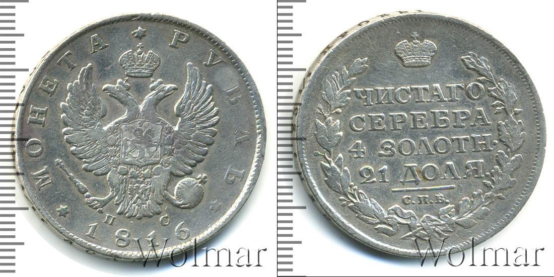 Имперская корона изображена над головами двуглавого орла. Геральдический символ Российской Империи держит в лапах скипетр и державу. Аббревиатура «МФ» указана под птицей и означает инициалы Михаила Федорова. Край легенды украшен рельефным узором с зубчиками. Вдоль него изогнутой линией написано «МОНЕТА», «РУБЛЬ», «1816».