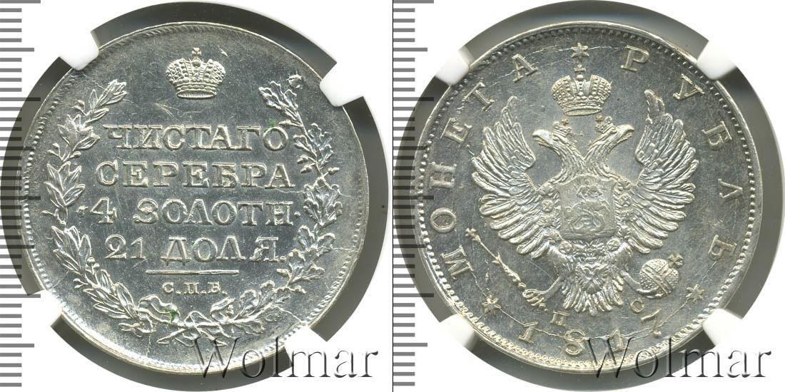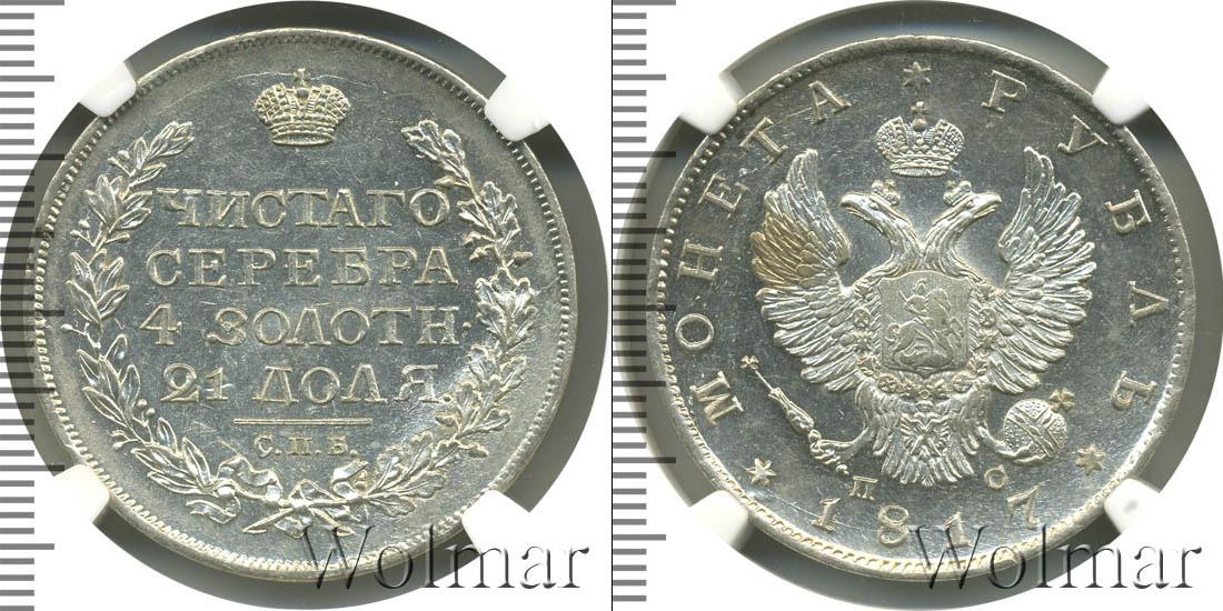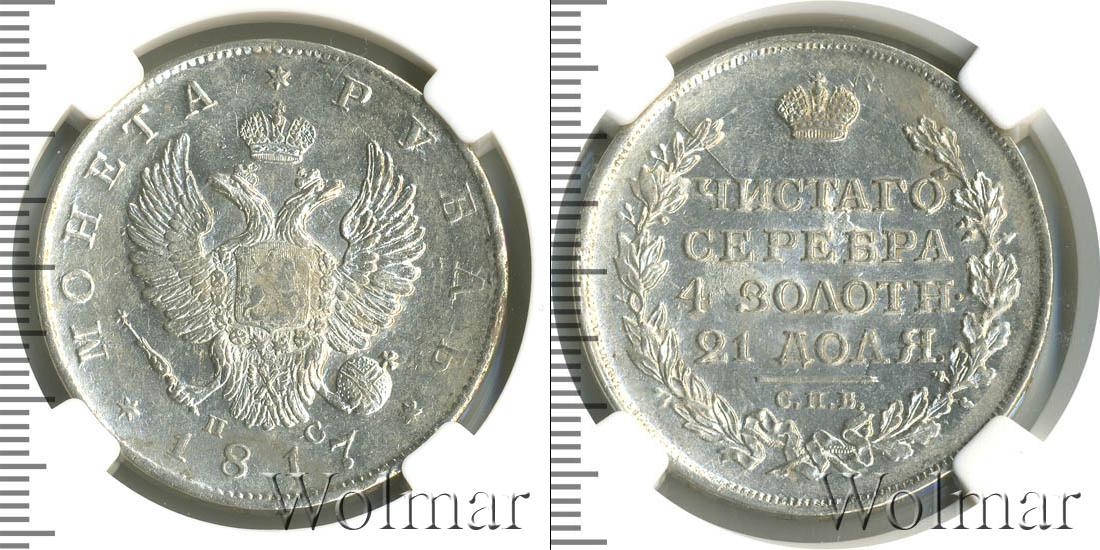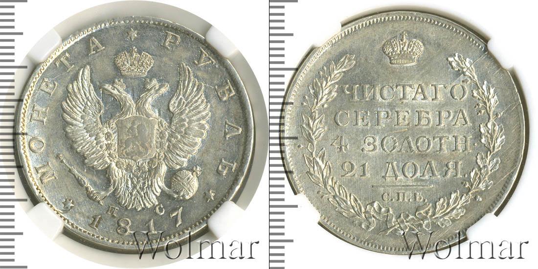 Радиальная надпись «МОНЕТА РУБЛЬ 1817» огибает периметр диска. Между фрагментами надписи вставлены шестиконечные звезды. Внутри информации о тираже расположено объемное изображение коронованного двуглавого орла и инициалы Павла Ступицына, минцмейстера монетного двора в Санкт Петербурге - «ПС».
