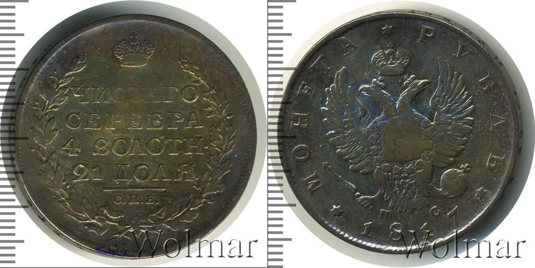 Радиальная надпись «МОНЕТА РУБЛЬ 1817» огибает периметр диска. Между фрагментами надписи вставлены шестиконечные звезды. Внутри информации о тираже расположено объемное изображение коронованного двуглавого орла и инициалы Павла Ступицына, минцмейстера монетного двора в Санкт Петербурге - «ПС».
