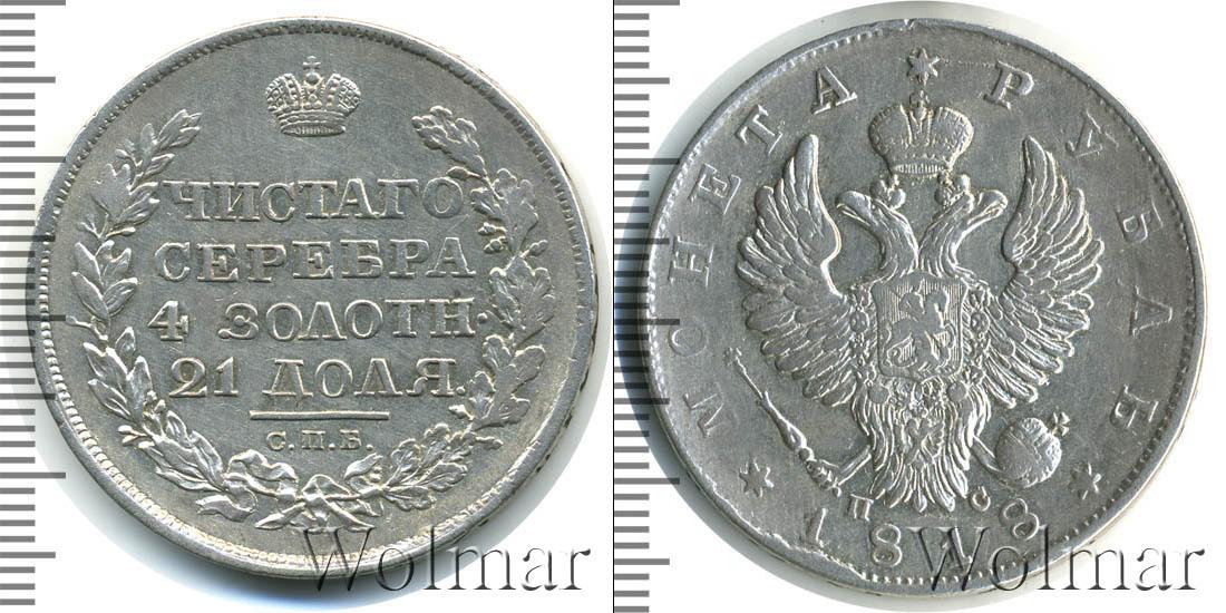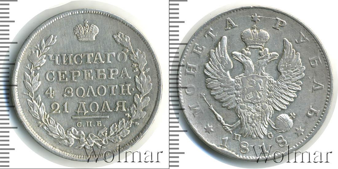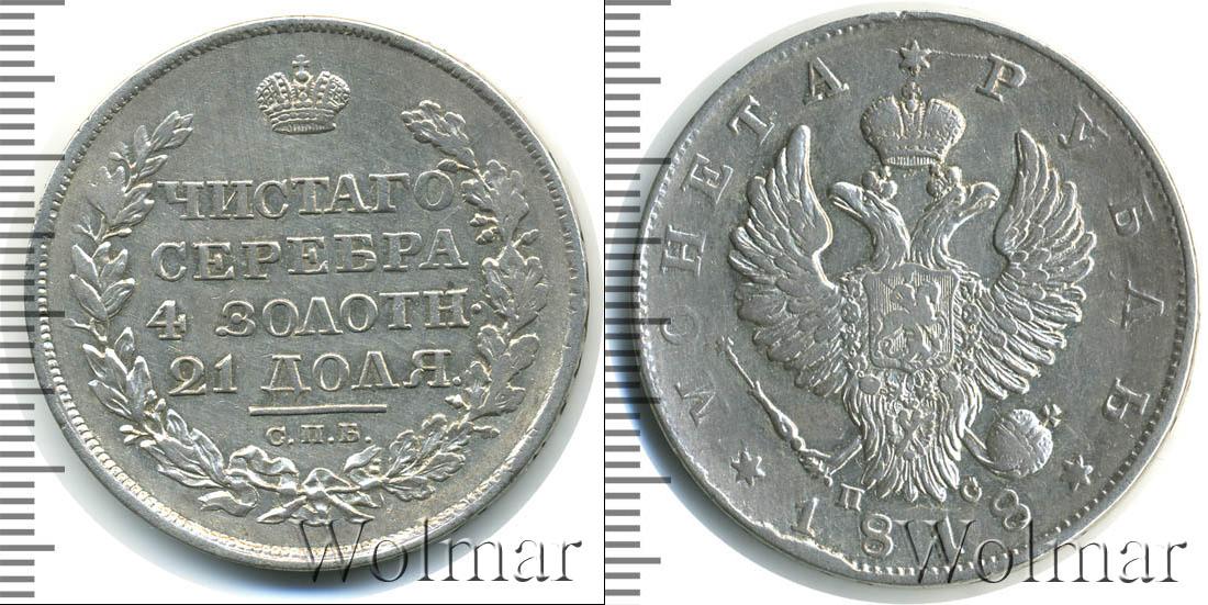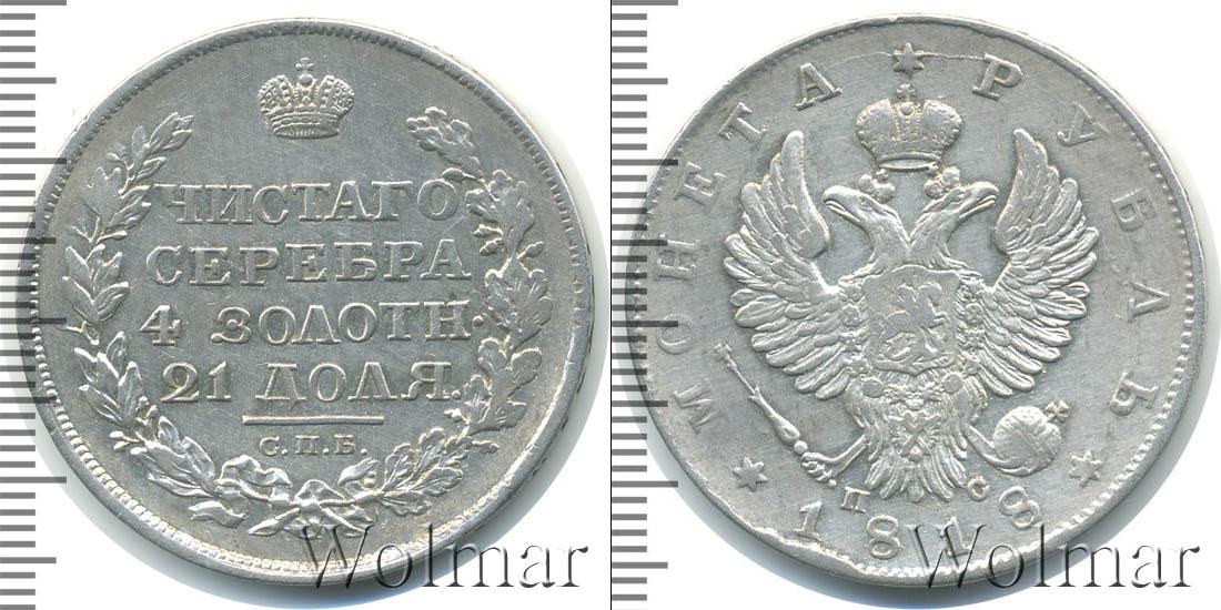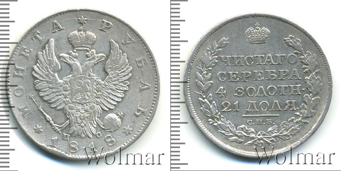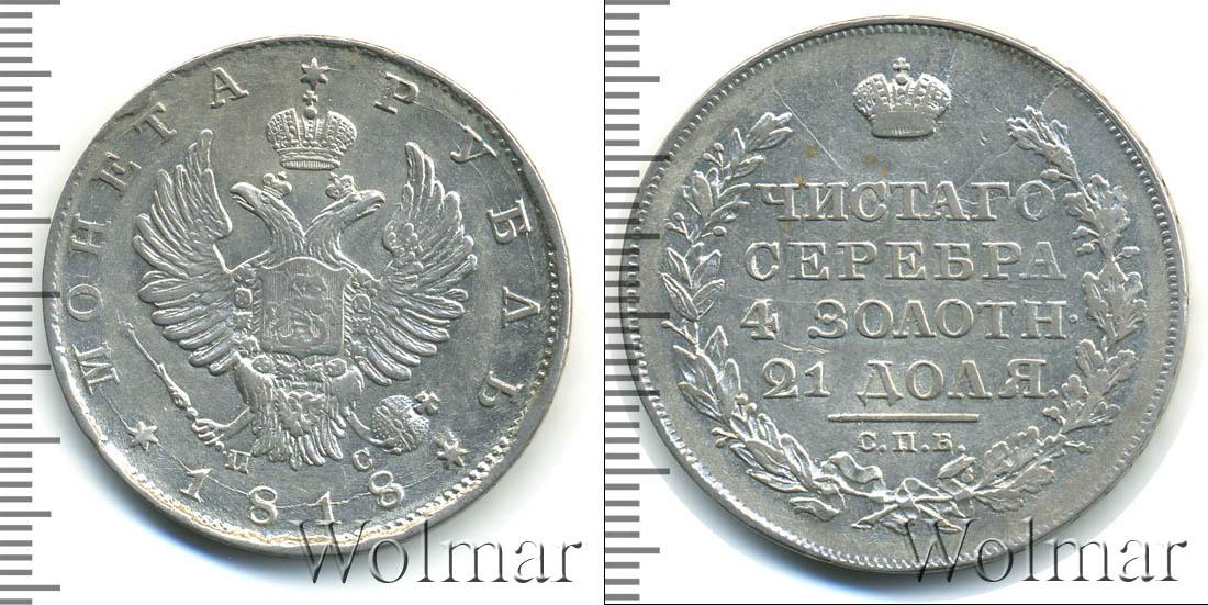 Государственный геральдический символ занимает большую часть диска. Над головами двуглавого орла выгравирована корона. В лапах птицы изображена держава и скипетр. Рядом с символами власти отображены данные о минцмейстере в виде инициалов «СП». Вдоль зубчатого канта написаны сведения о номинале и годе эмиссии: «1818 * МОНЕТА * РУБЛЬ».