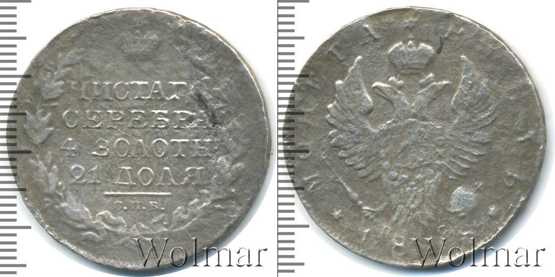 Государственный геральдический символ занимает большую часть диска. Над головами двуглавого орла выгравирована корона. В лапах птицы изображена держава и скипетр. Рядом с символами власти отображены данные о минцмейстере в виде инициалов «СП». Вдоль зубчатого канта написаны сведения о номинале и годе эмиссии: «1818 * МОНЕТА * РУБЛЬ».