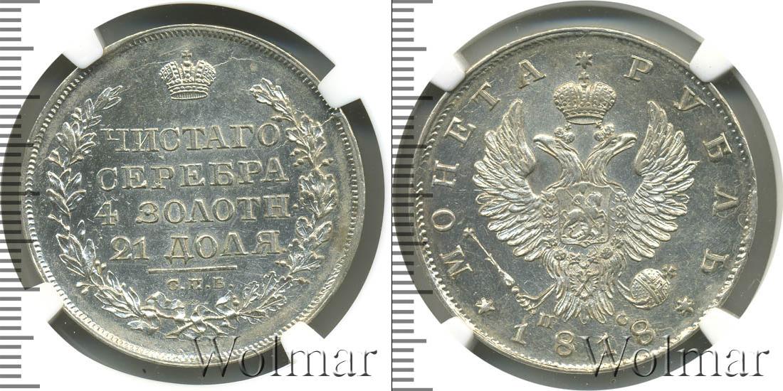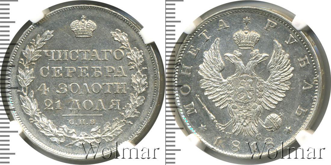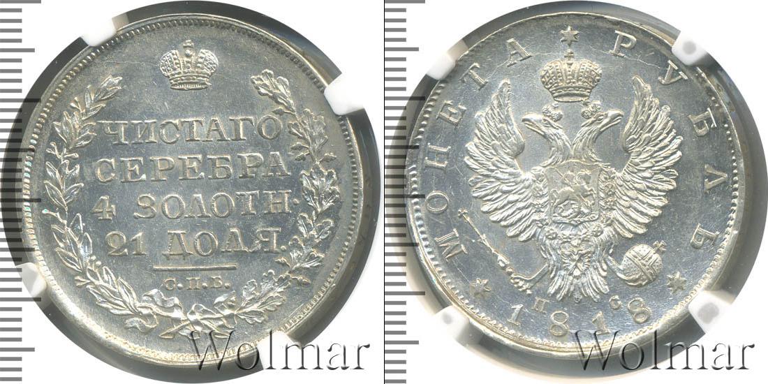 Государственный геральдический символ занимает большую часть диска. Над головами двуглавого орла выгравирована корона. В лапах птицы изображена держава и скипетр. Рядом с символами власти отображены данные о минцмейстере в виде инициалов «СП». Вдоль зубчатого канта написаны сведения о номинале и годе эмиссии: «1818 * МОНЕТА * РУБЛЬ».