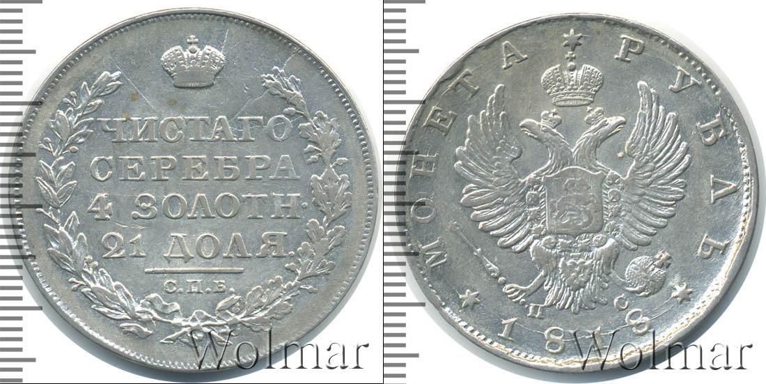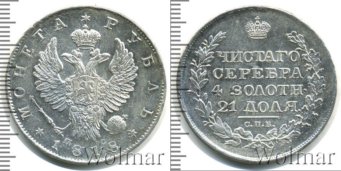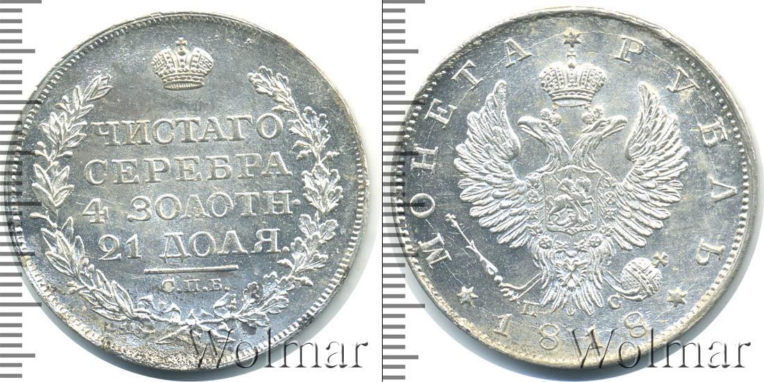 Государственный геральдический символ занимает большую часть диска. Над головами двуглавого орла выгравирована корона. В лапах птицы изображена держава и скипетр. Рядом с символами власти отображены данные о минцмейстере в виде инициалов «СП». Вдоль зубчатого канта написаны сведения о номинале и годе эмиссии: «1818 * МОНЕТА * РУБЛЬ».