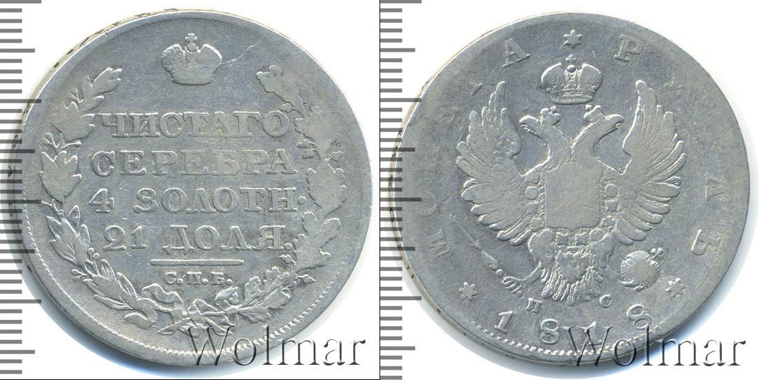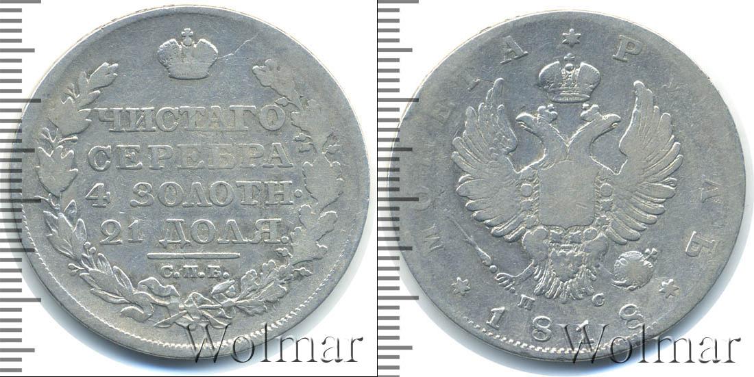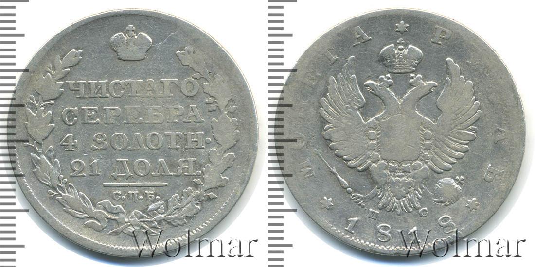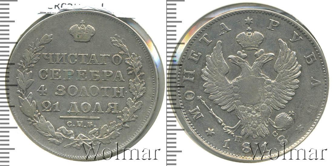 Государственный геральдический символ занимает большую часть диска. Над головами двуглавого орла выгравирована корона. В лапах птицы изображена держава и скипетр. Рядом с символами власти отображены данные о минцмейстере в виде инициалов «СП». Вдоль зубчатого канта написаны сведения о номинале и годе эмиссии: «1818 * МОНЕТА * РУБЛЬ».