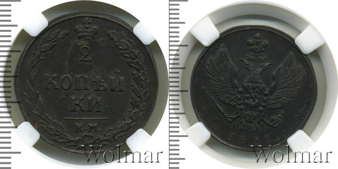 Слева и справа вдоль края идет узор из лавровой и дубовой ветвей, в верхней части изображена императорская корона, под ней отчеканен номинал монеты в 3 строки «2», «КОП?Й» и «КИ.». Под номиналом, отделенные небольшой чертой, выбиты инициалы монетного двора «К.М.»