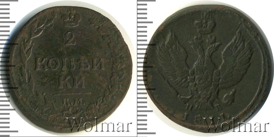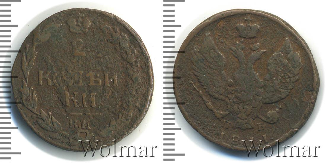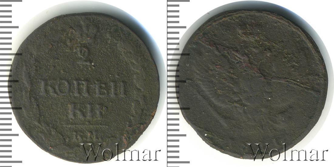 Слева и справа вдоль края идет узор из лавровой и дубовой ветвей, в верхней части изображена императорская корона, под ней отчеканен номинал монеты в 3 строки «2», «КОП?Й» и «КИ.». Под номиналом, отделенные небольшой чертой, выбиты инициалы монетного двора «К.М.»