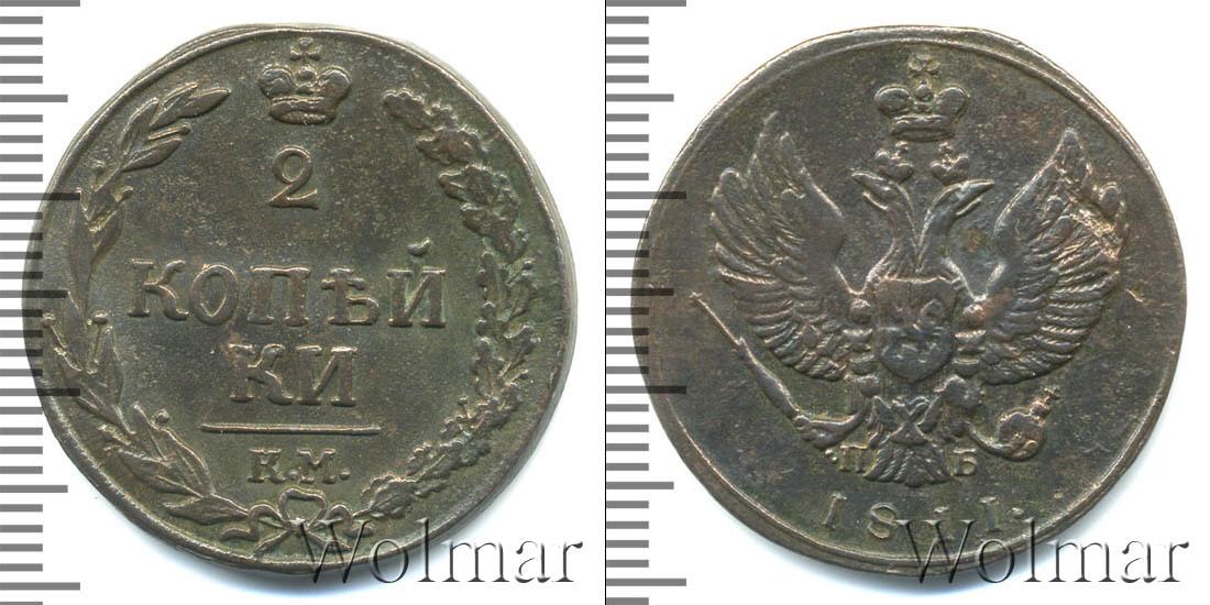 Слева и справа вдоль края идет узор из лавровой и дубовой ветвей, в верхней части изображена императорская корона, под ней отчеканен номинал монеты в 3 строки «2», «КОП?Й» и «КИ.». Под номиналом, отделенные небольшой чертой, выбиты инициалы монетного двора «К.М.»