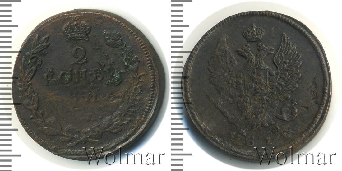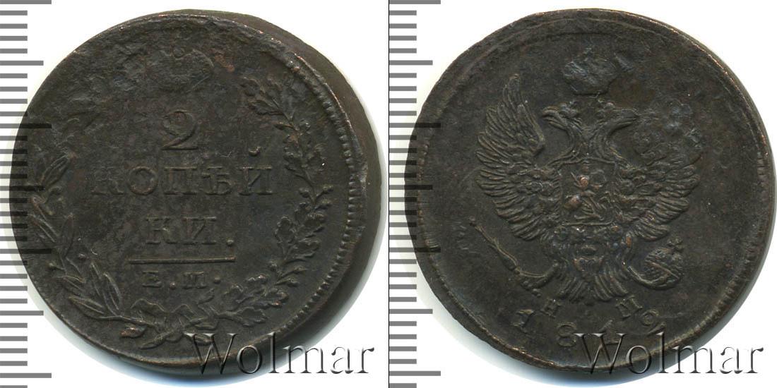 С этой стороны монеты в четыре строки начертано: 2 КОПЕЙКИ КМ. Это номинал и монетный двор, где была отчеканена монеты (Колпинский монетный двор). Вверху Императорская корона России, а внизу изображение лавровой и дубовой ветвей, перевязанных лентой.