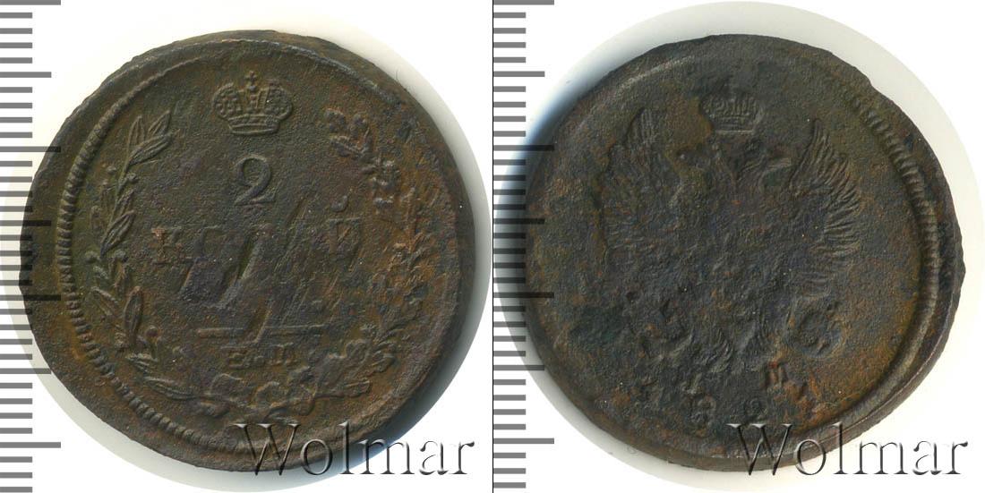 В центральной части диска указание на номинал и Екатеринбургский монетный двор: 2 КОПЕЙКИ КМ. Вверху детально прорисованная Императорская корона России. Внизу переплетенные между собой лавровая и дубовая ветви.