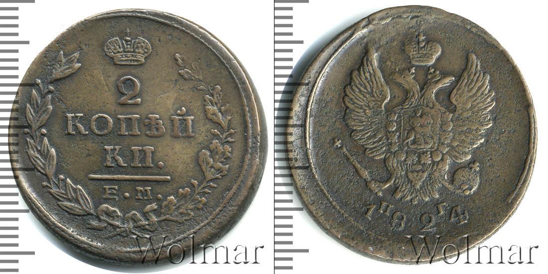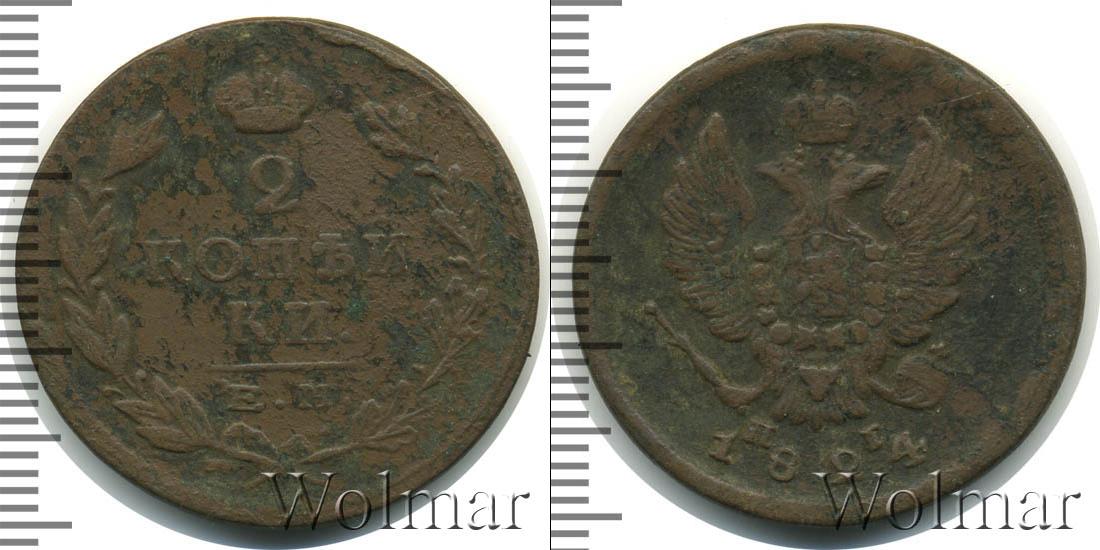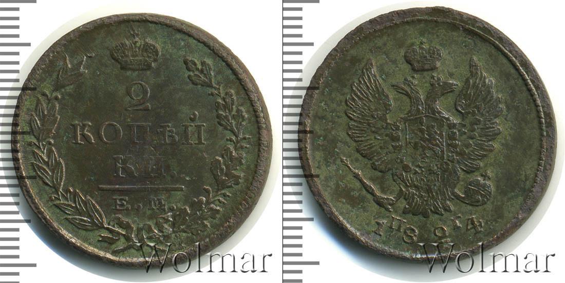 Медная монета с изображением Большой короны Российской Империи, выпуклым узором из лавровой и дубовой ветвей и указание на номинал монеты (в центре отчеканено 2 КОПЕЙКИ). Под фигурной линией внизу обозначение монетного двора – ЕМ.