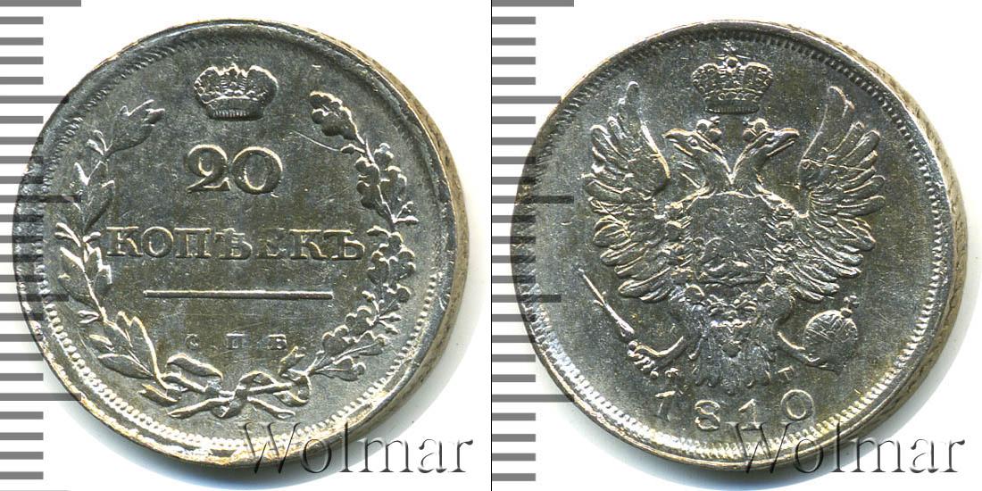 Серебряная монета массой 4,8 г. и диаметром 22,1 мм. На диске изображен Государственный герб Российской Империи. Внизу указание на год эмиссии монеты – 1810. Около хвостов двуглавого орла отмечены инициалы минцмейстера – ФГ. По краю диска идет узор из множества зубцов.