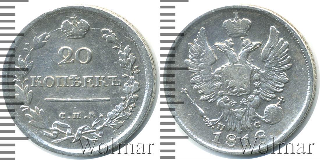 Серебряная монета массой 4,15 г. и диаметром 22,1 мм. На диске изображен Государственный герб Российской Империи. Внизу указание на год эмиссии монеты – 1818. Около хвостов двуглавого орла отмечены инициалы минцмейстера – ПС. По краю диска идет узор из множества зубцов.