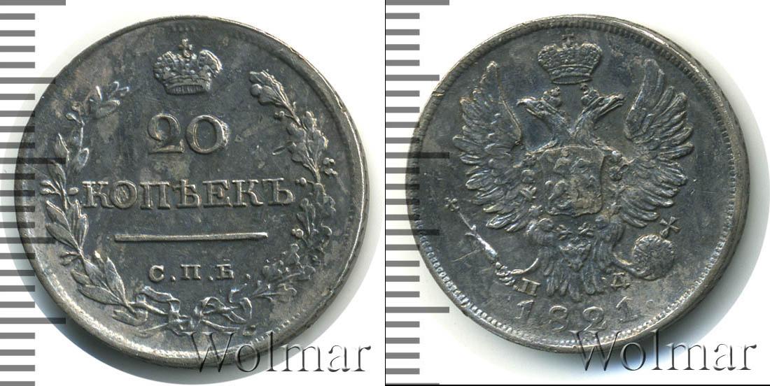 Изображение двуглавого орла в императорской короне, со скипетром и державой – герб Российской Империи. Внизу отмечены инициалы минцмейстера (ПД) и дата чеканки монеты – 1821. Вдоль канта идет зубчатый орнамент, как и с оборотной стороны монеты.