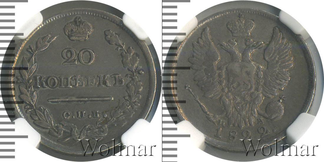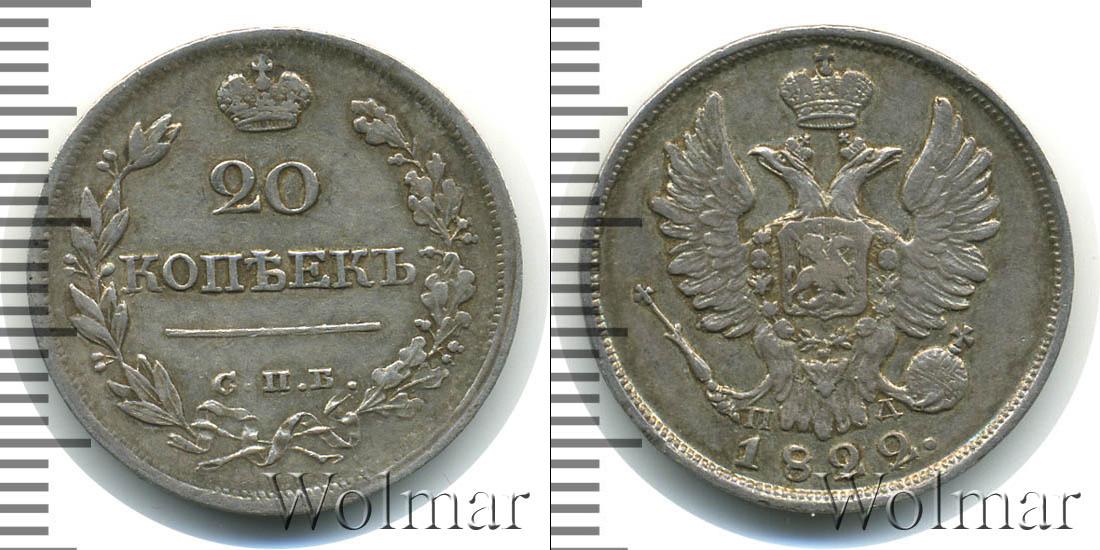 Масса готового изделия составляет 4,8 г., а диаметр равен 22,1 мм. Показан Государственный герб Российской Империи. Внизу указание на год эмиссии монеты – 1822. Около хвостов двуглавого орла обозначение минцмейстера – ПД.