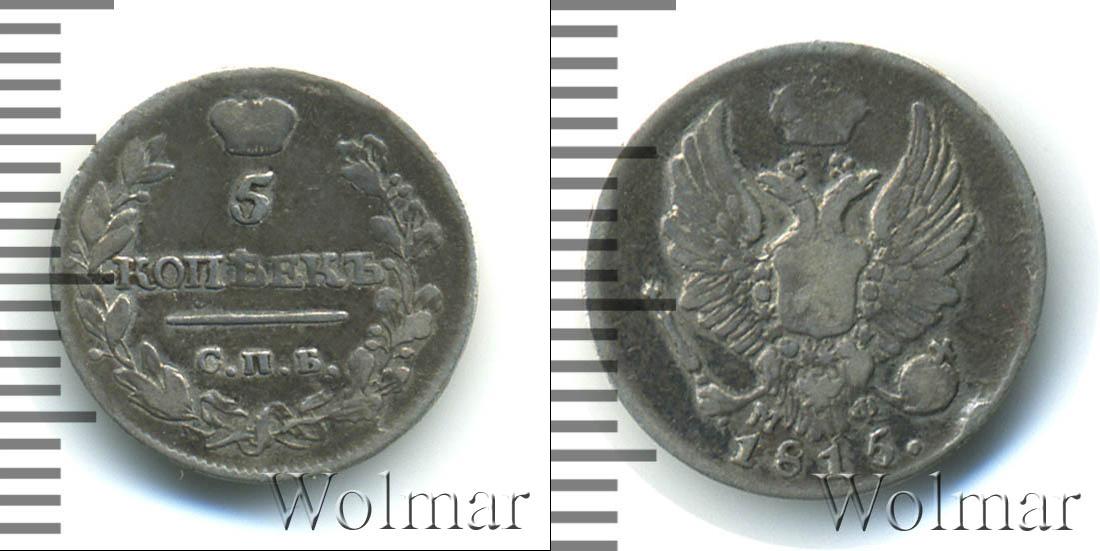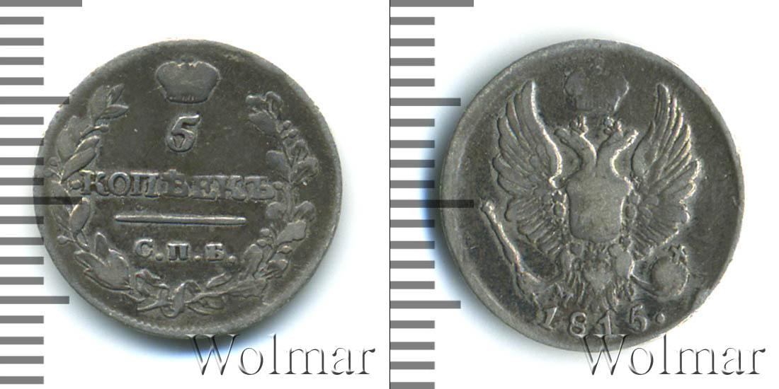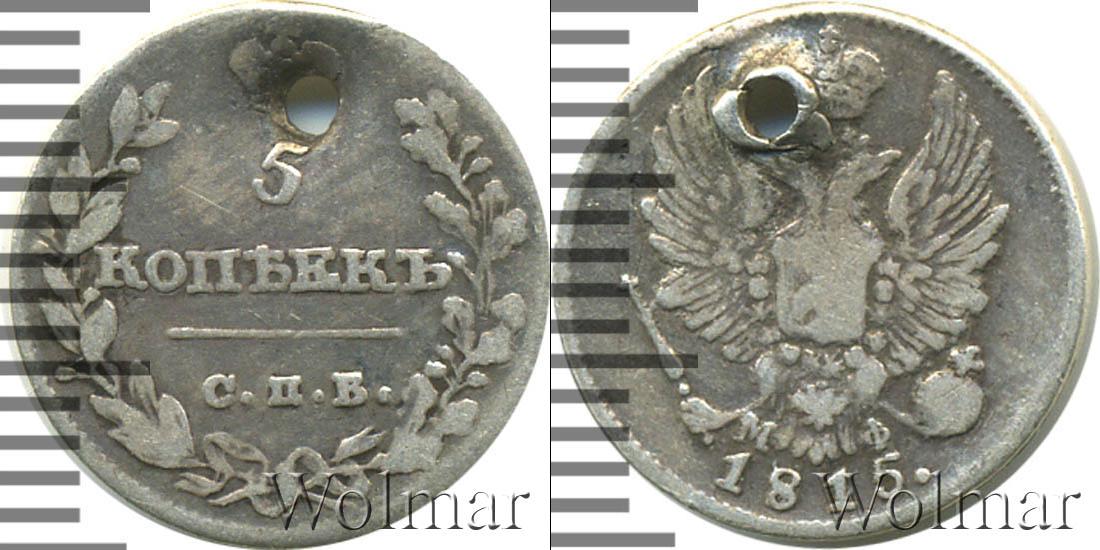 Масса готового изделия составляет 1,03 г., а диаметр равен 15,1 мм. По центру детально показан Государственный герб Российской Империи. Внизу полукругом начертано: 1815. Это дата эмиссии партии. Также на диске отмечены инициалы минцмейстера – МФ.