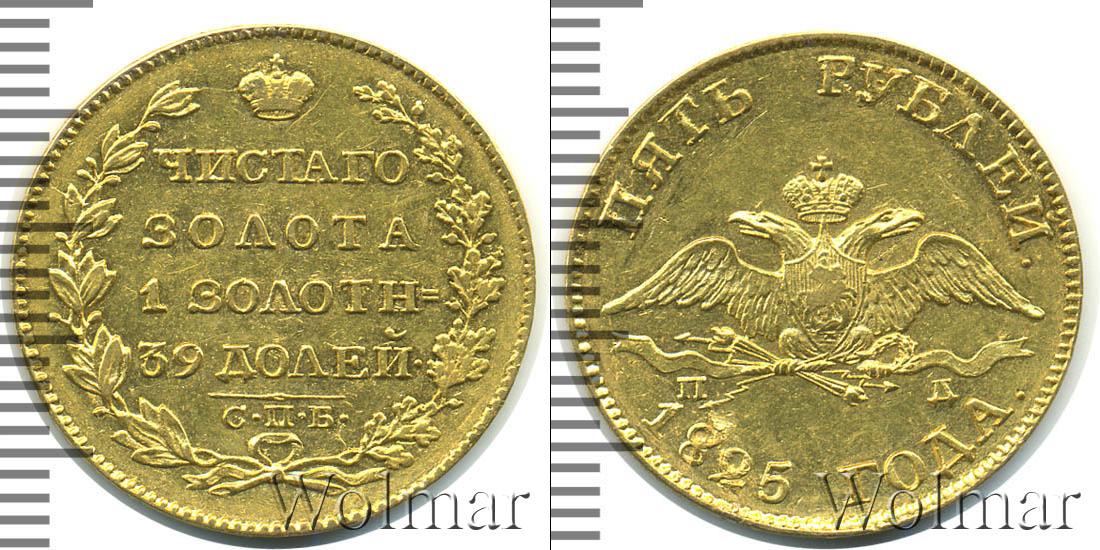 Монета отчеканена из золота (проба 917/1000). В центре изображен герб Российской Империи первой половины девятнадцатого столетия. Внизу указаны инициалы минцмейстера Павла Данилова «ПД». На диске монеты расположены две надписи. Вверху – ПЯТЬ РУБЛЕЙ. И внизу – 1825 ГОДА. Вдоль канта идет зубчатый орнамент.