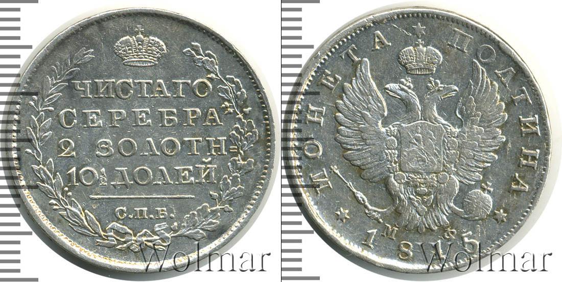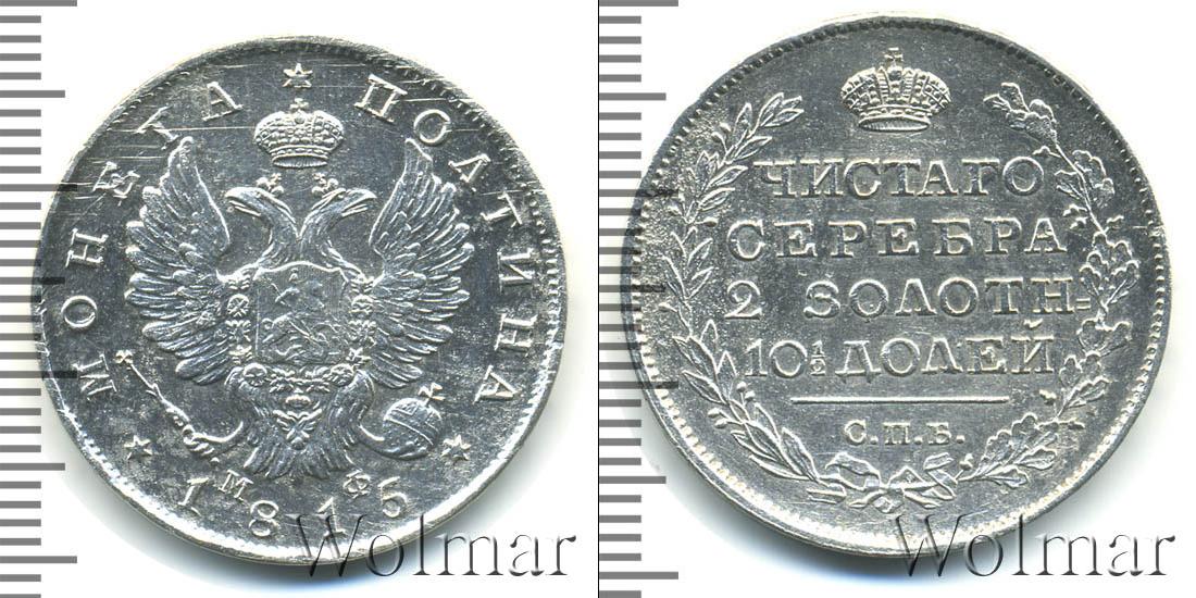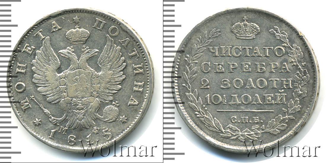 Серебряная монета массой 10,37 г. и диаметром 28,5 мм. Показан герб Российской Империи. Внизу дата эмиссии – 1815, а слева и справа от нее начертано: МОНЕТА ПОЛТИНА. Под изображением двуглавого орла указаны инициалы МФ.