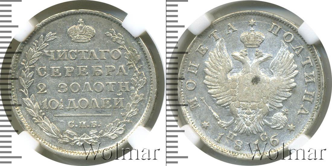 Показан герб Российской Империи. Внизу мы видим дату эмиссии – 1816, а слева и справа от нее начертано: МОНЕТА ПОЛТИНА. Под изображением двуглавого орла указаны инициалы минцмейстера – ПС.