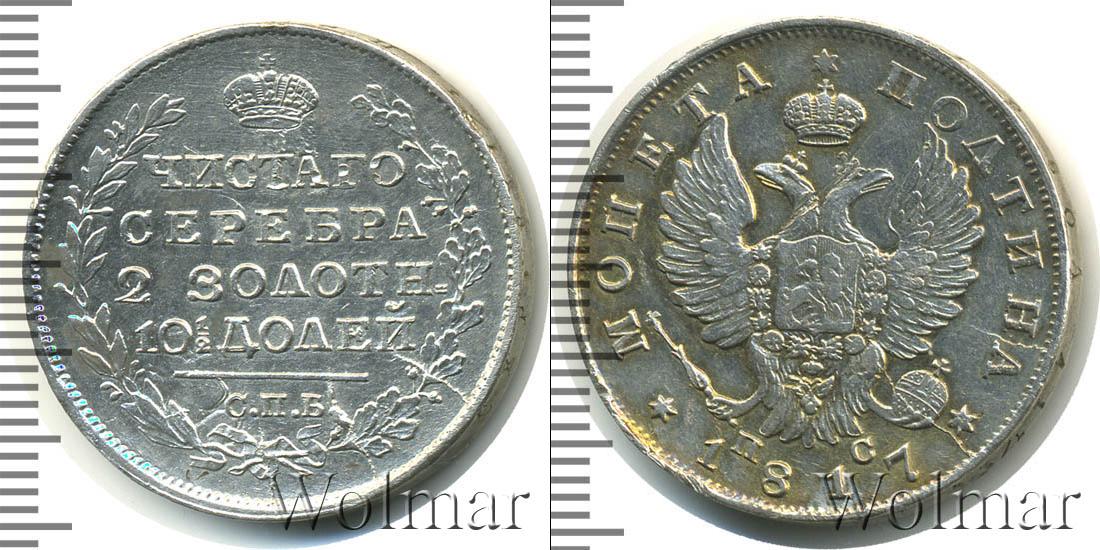 Тиражная монета с изображением Императорской короны России и венка из дубовой и лавровой ветвей. По центру диска начертаны слова: ЧИСТОГО СЕРЕБРА 2 ЗОЛОТН. 10 1/2 ДОЛЕЙ. Вдоль канта идет точечный орнамент, как и с лицевой стороны монеты.