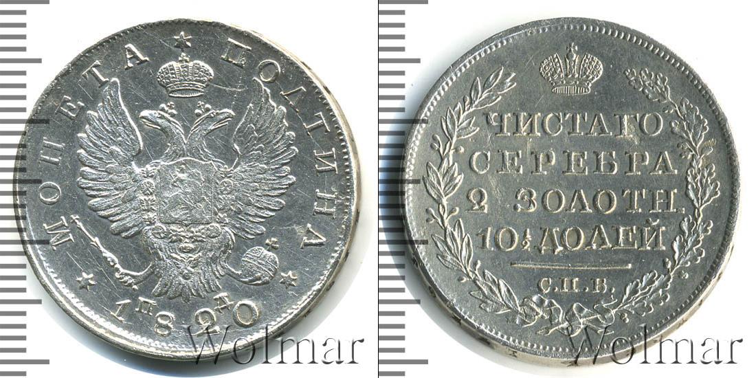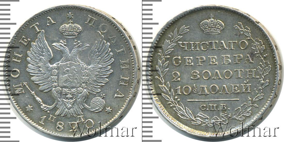 В центре гербовая эмблема Российской Империи. Слева и справа начертано: МОНЕТА ПОЛТИНА. Внизу отмечена дата эмиссии партии: 1820. Рядом указаны инициалы минцмейстера – ПД.