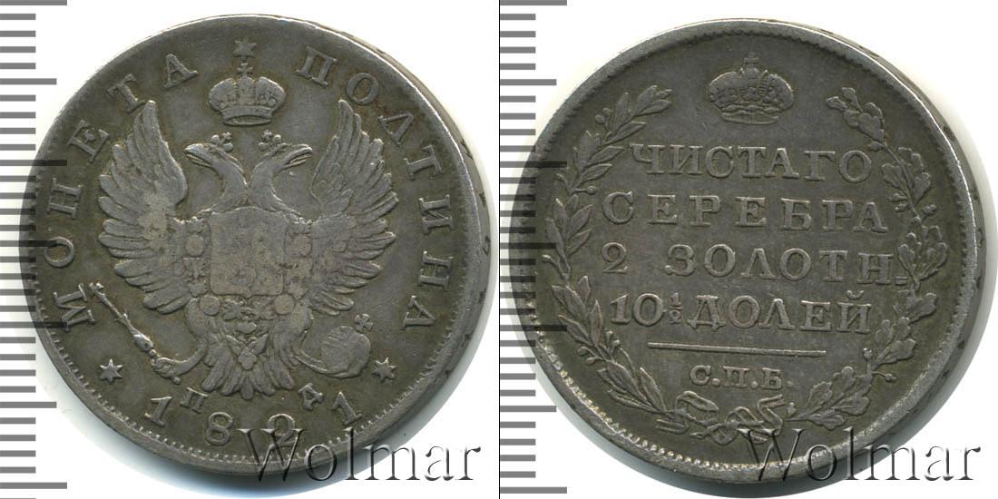Монета отчеканена из серебра (проба 868/1000). Показан герб Российской Империи. Внизу отмечена дата эмиссии – 1821. А слева и справа от нее начертано: МОНЕТА ПОЛТИНА. Под изображением двуглавого орла указаны инициалы ПД.