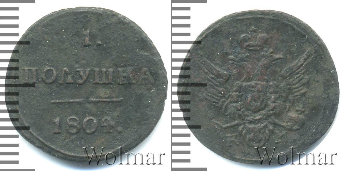 Сверху вниз в четыре строки начертано: 1 ПОЛУШКА (прямая черта) 1804. Это указание на номинал монеты и дату эмиссии партии. Край оформлен в виде тонкого ободка.