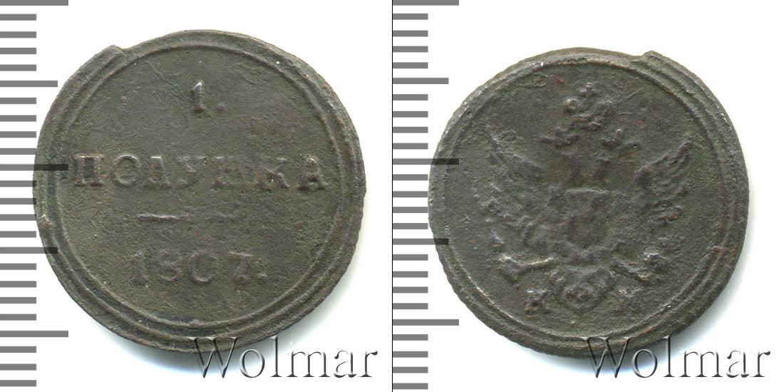 Край диска оформлен аналогично аверсу – зубчатый орнамент. Вверху указан номинал монеты –ПОЛУШКА. Над ней цифра «1». А внизу (под чертой) отметка о дате эмиссии партии: 1807.