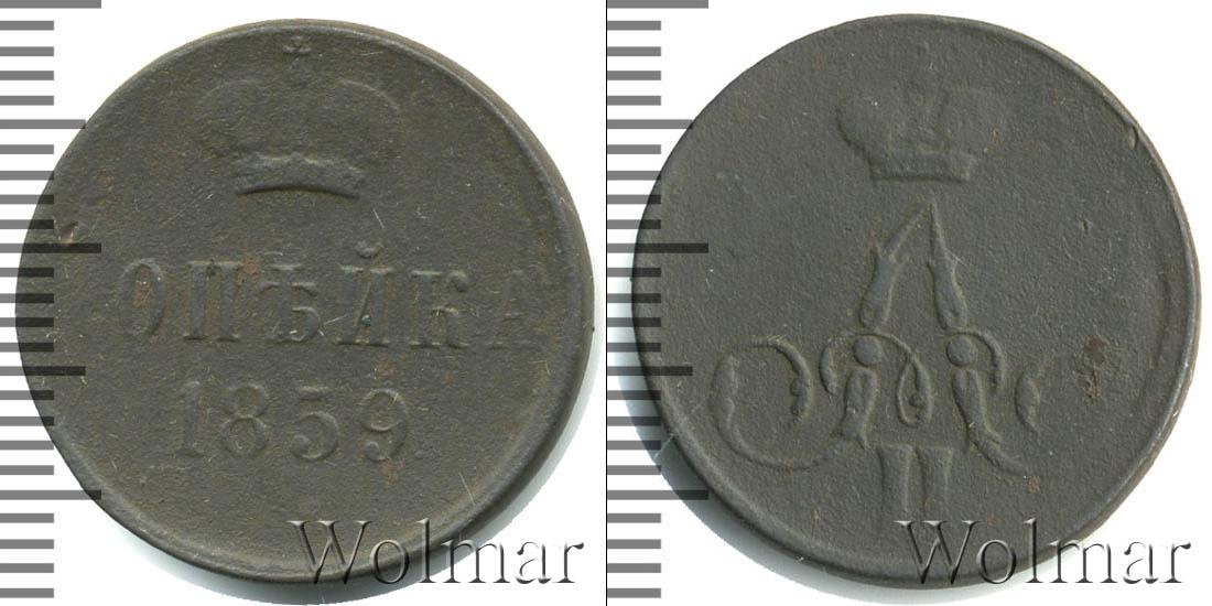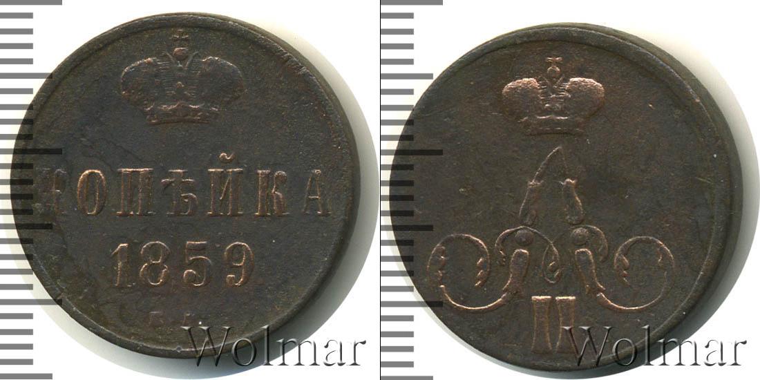 Екатеринбургский монетный двор. Биткин №# 891.354, тираж 11 059 200, Уздеников №# 3598, монета образца 1859 г., Ильин - 1 рубль. Wolmar # 190/14. 1 копейка Ильин - 1 рубль ЕМ