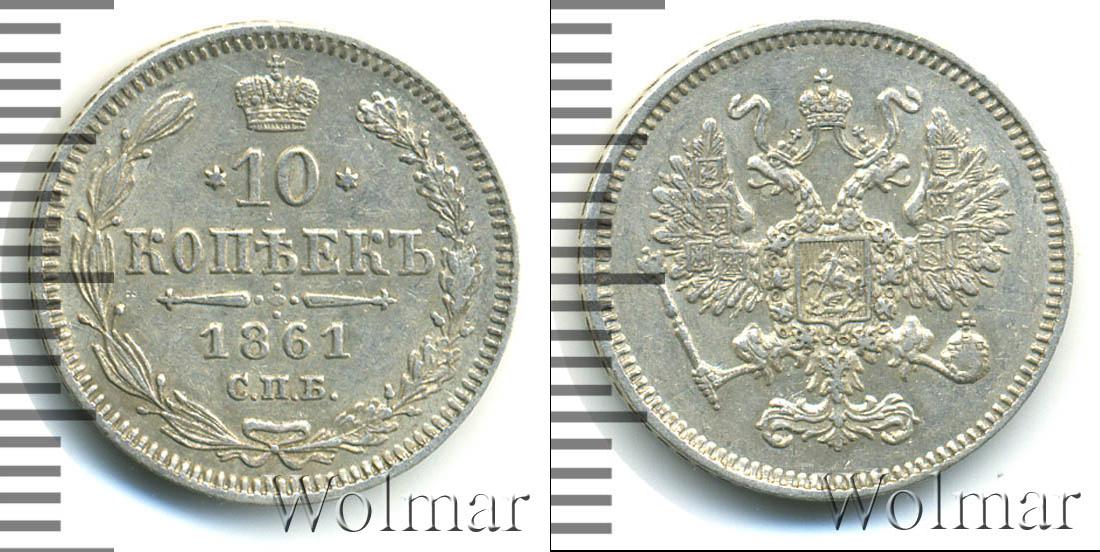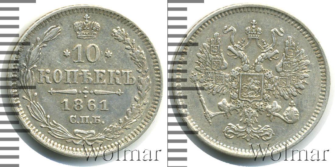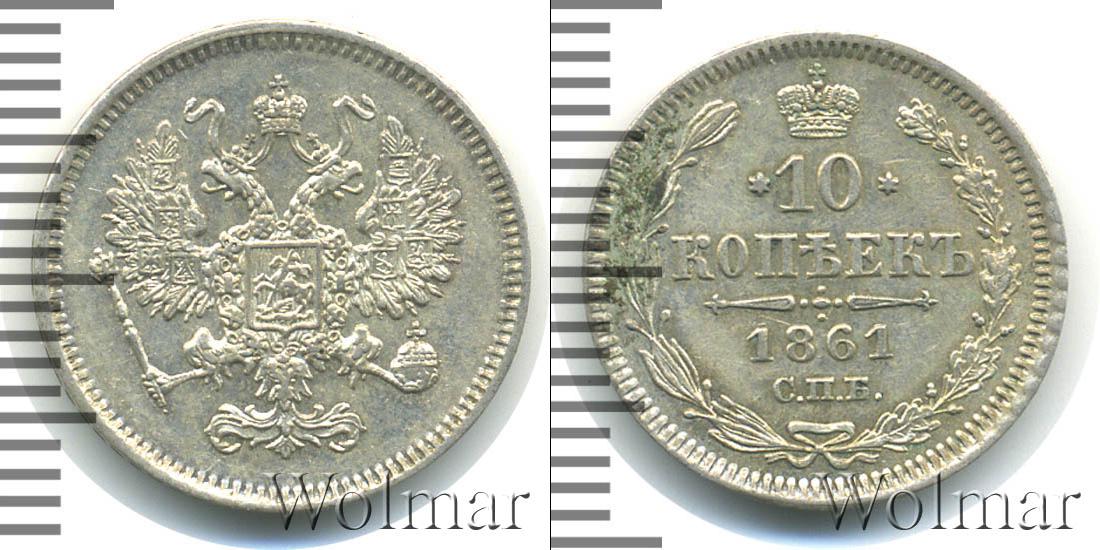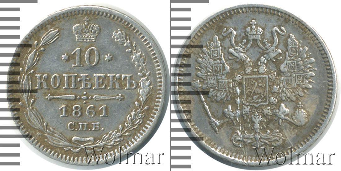 На оборотной стороне монеты указаны номинал, место и дата выпуска этой партии монет: 10 КОПЕЕК 1861 С.П.Б. Вверху схематически показана Малая корона России времен правления Александра II. Внизу – стилизованный узор из двух ветвей (лавровой и дубовой).