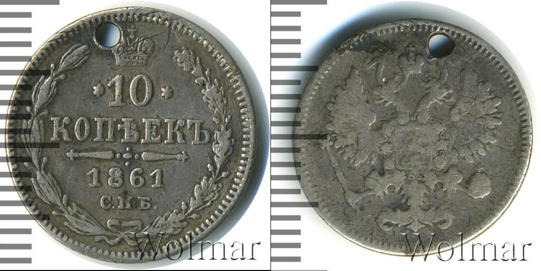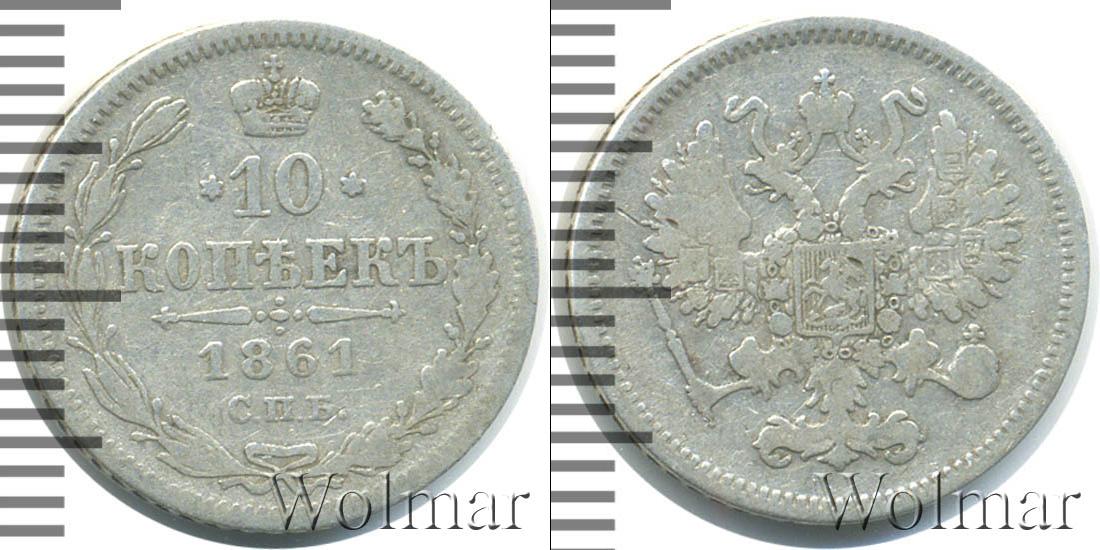 На оборотной стороне монеты указаны номинал, место и дата выпуска этой партии монет: 10 КОПЕЕК 1861 С.П.Б. Вверху схематически показана Малая корона России времен правления Александра II. Внизу – стилизованный узор из двух ветвей (лавровой и дубовой).