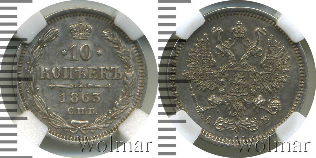 В слабе PCGS. Санкт-Петербургский монетный двор. Биткин №# 882.199, тираж 5 750 003, Уздеников №# 1818. По каталогу Wolmar # 139/10. 10 копеек СПБ АБ