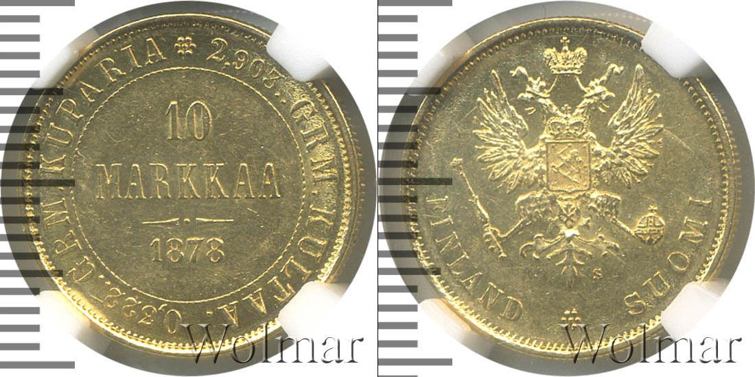 В слабе NGC. Гельсингфорсский монетный двор. Биткин редкость - R, №# 908.618, тираж 254 000, Уздеников редкость - "черта", №# 4714. Нормативная проба - Au`900, нормативный вес - 3,23 гр, чистого золота - 2,91гр; По каталогу Wolmar # 447/1. 10 марок.