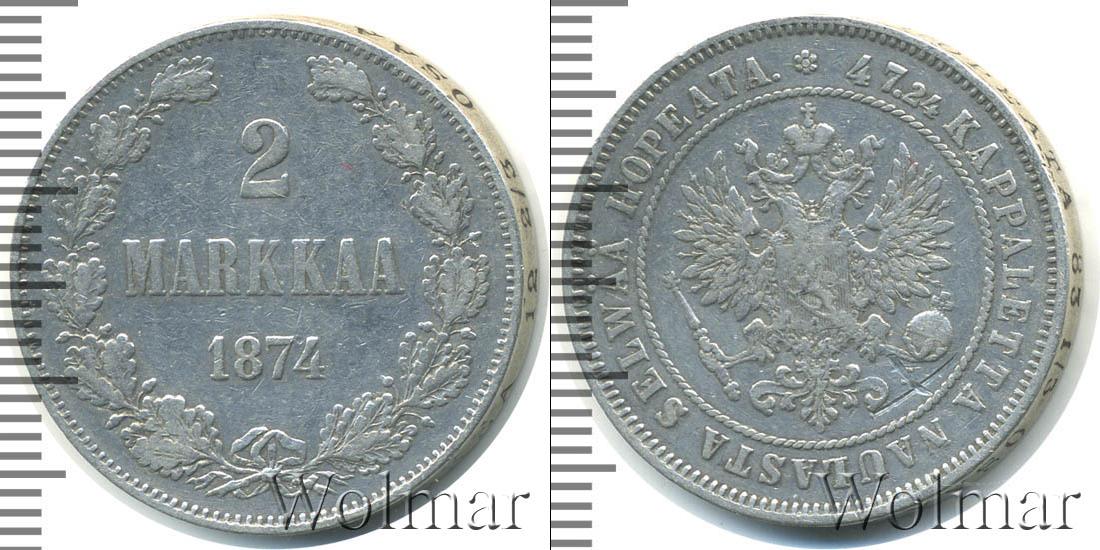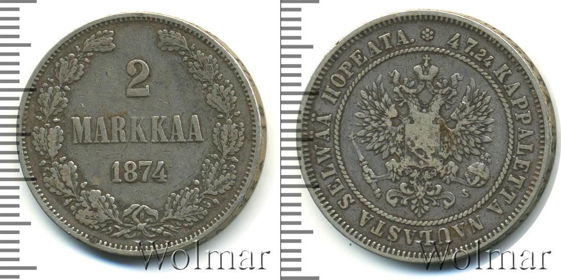 По центру сверху-вниз начертано: 2 MARKKAA 1874. Это указание на номинал и дату эмиссии монеты. Внизу мы видим узор из дубовых ветвей, скрепленных одной лентой. Вдоль канта – зубчатый орнамент.