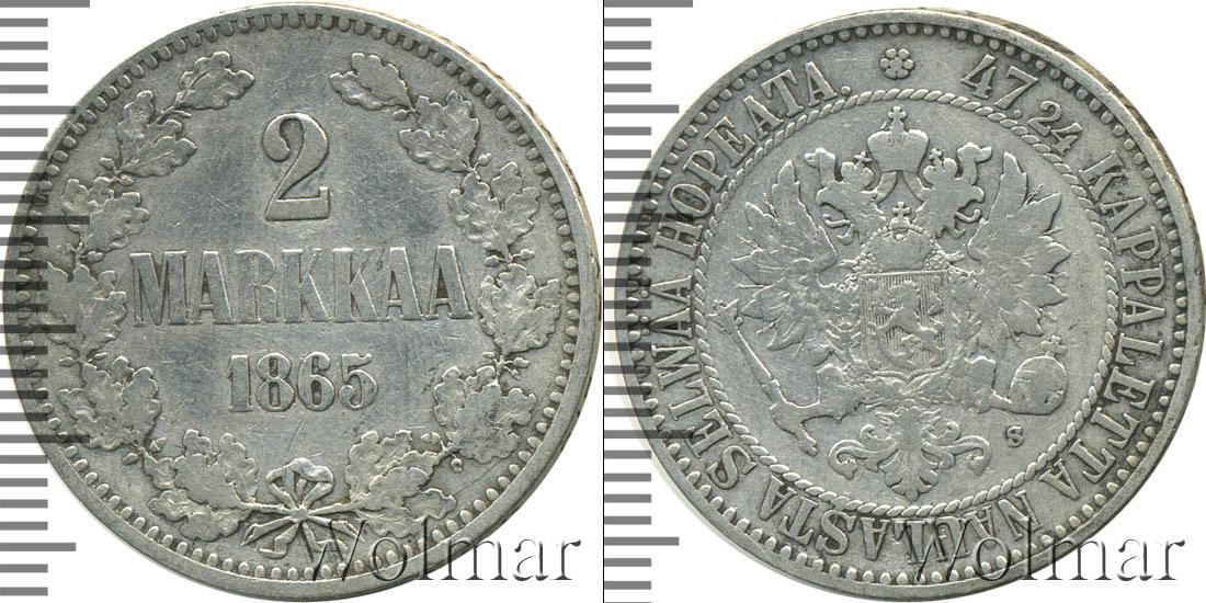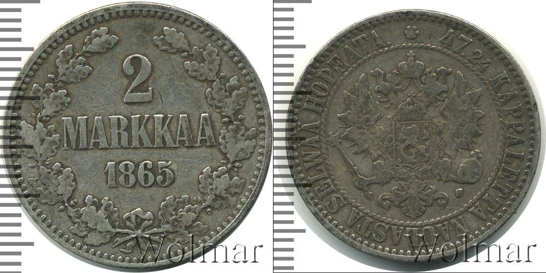 Большую часть диска занимают дубовая и лавровая ветви, скрепленные узорчатой лентой. В центре отмечены номинал и дата эмиссии монеты: 2 MARKKAA 1865. Вдоль канта точечный орнамент.