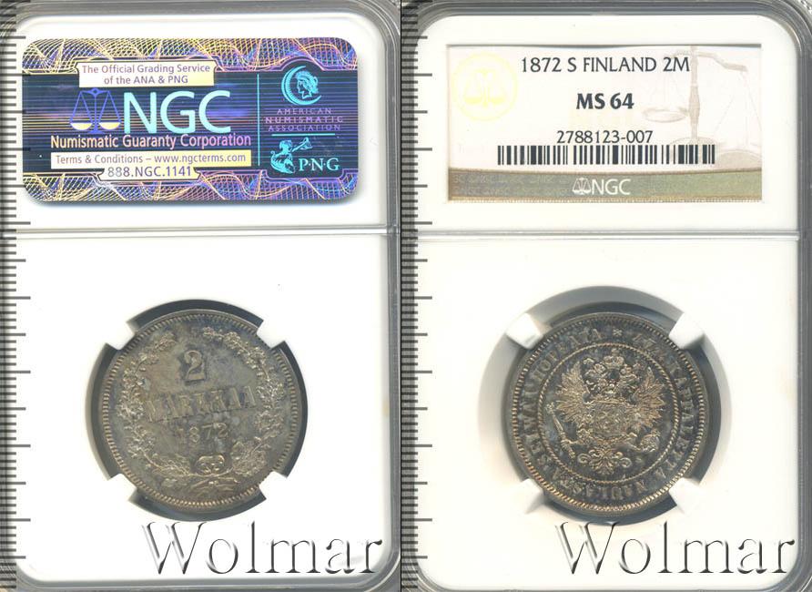 В слабе NGC. Гельсингфорсский монетный двор. Биткин №# 910.622, тираж 250 000; Уздеников №# 4692. По каталогу Wolmar # 448/5. 2 марки. Финляндия S