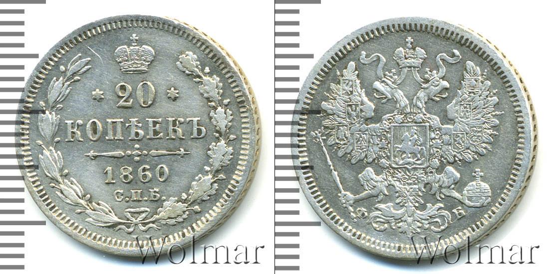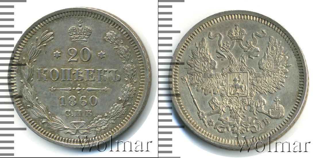 Санкт-Петербургский монетный двор. Биткин №# 880.161, Ag`868, тираж 1 070 001, Уздеников редкость - "точка", №# 1773, монета образца 1859 г. Wolmar # 124/2. 20 копеек СПБ ФБ