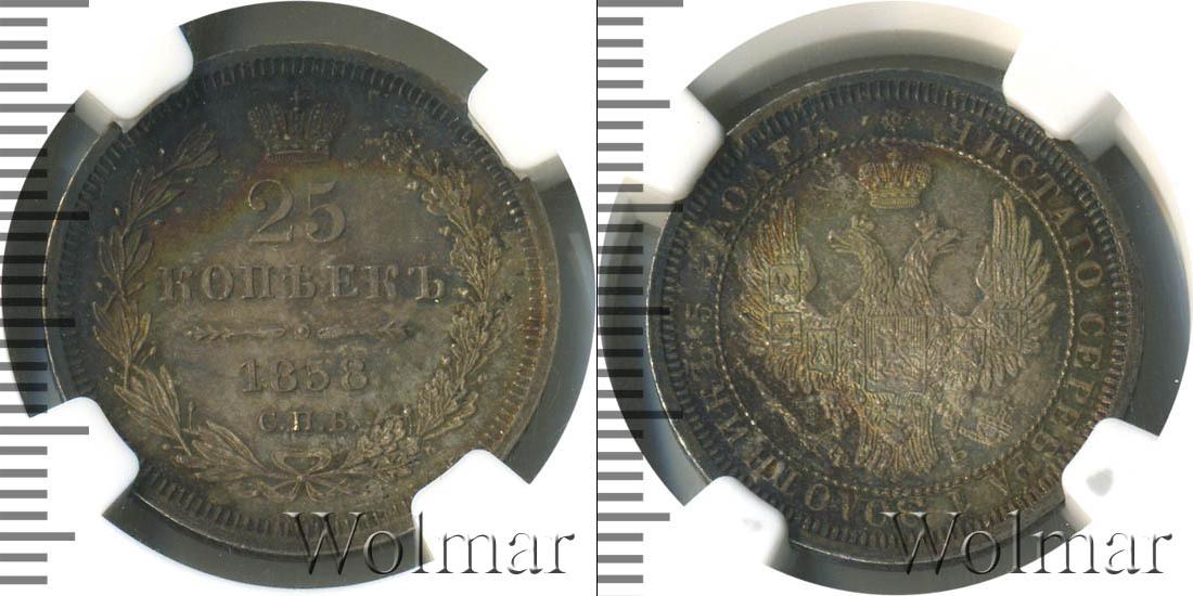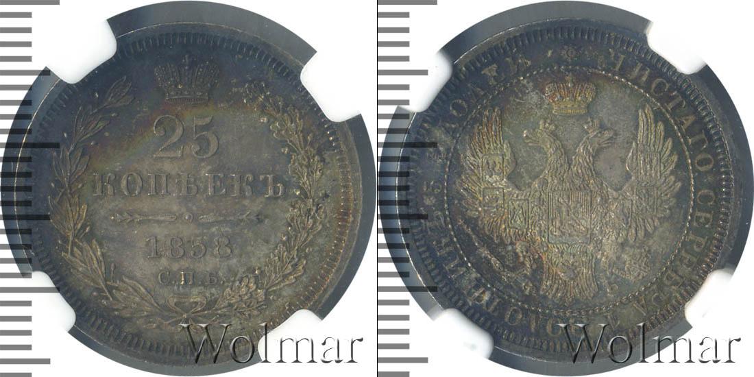 Очень высокий грейд - большая редкость. В слабе NGC. Санкт-Петербургский монетный двор. Биткин №# 876.56, тираж 5 528 002; Уздеников №# 1746. По каталогу Wolmar # 116/35. 25 копеек СПБ ФБ
