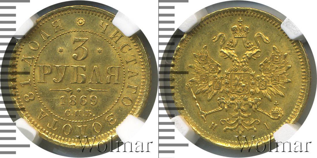 Надпись «ЧИСТОГО ЗОЛОТА 81 ДОЛЯ» выгравирована вдоль гурта. Центр золотого диска занимают данные о монете «3 РУБЛЯ» «1869», «с.п.б.», обрамленные точечным орнаментом.