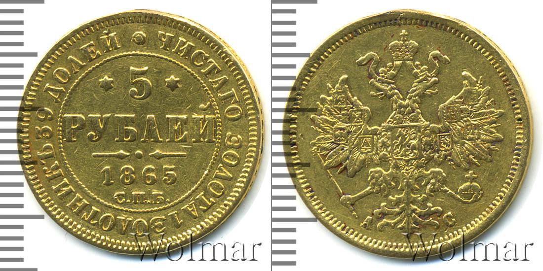 Край диска очерчен кантом с зубчатым узором. Параллельно расположена радиальная надпись «ЧИСТОГО ЗОЛОТА 1 ЗОЛОТНИКЪ 39 ДОЛЕЙ». Во внутреннем круге расположены информационные сведения: «5 РУБЛЕЙ / 1865 / с.п.б» , дополненные геометрическим и растительным о