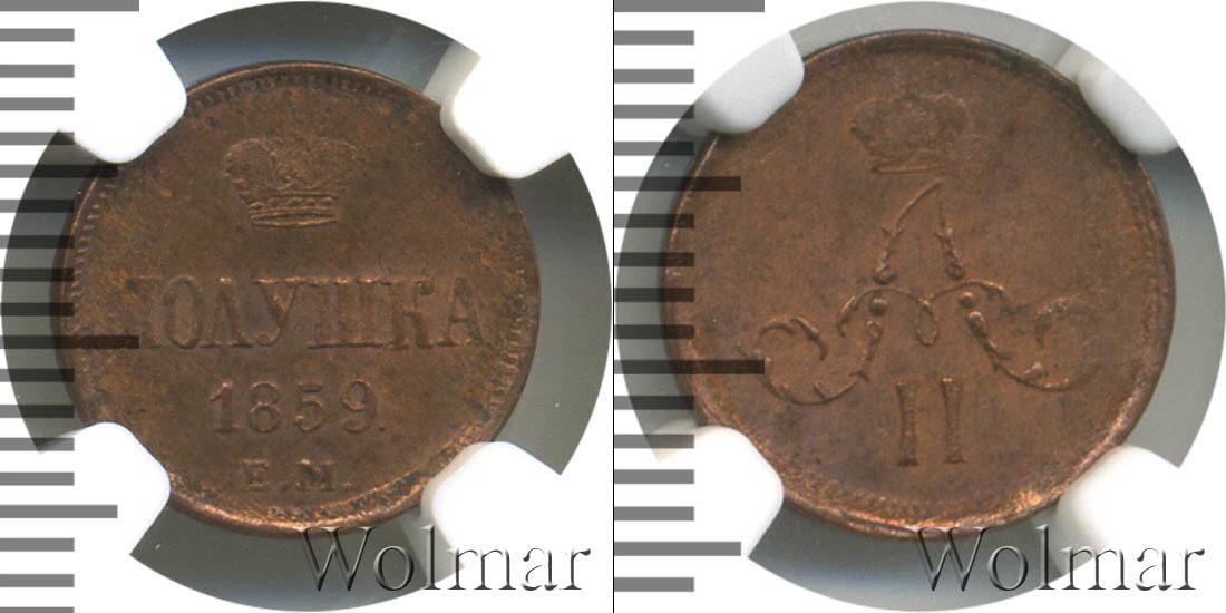 В слабе NGC. Екатеринбургский монетный двор. Биткин №# 892.383, тираж 3 833 600, Уздеников №# 3605, монета образца 1860 г. Wolmar # 213/14. Полушка ЕМ