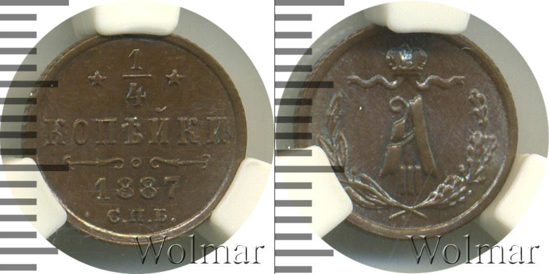 Гарантированный грейд ННР MS 63 BN. Санкт-Петербургский монетный двор. Биткин №# 925.210, тираж 1 000 000, Уздеников №# 3831. По каталогу Wolmar # 214/28. 1/4 копейки СПБ