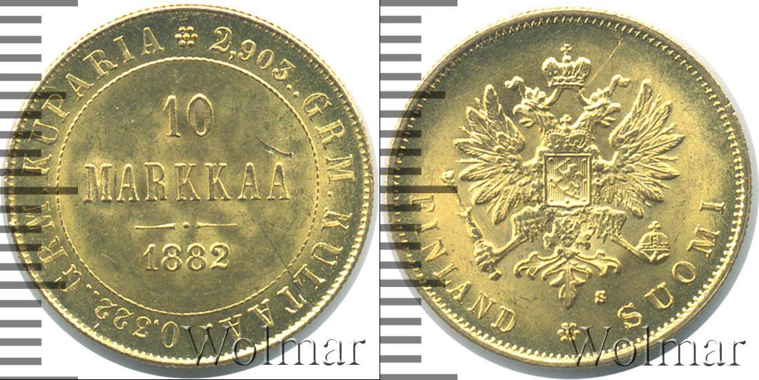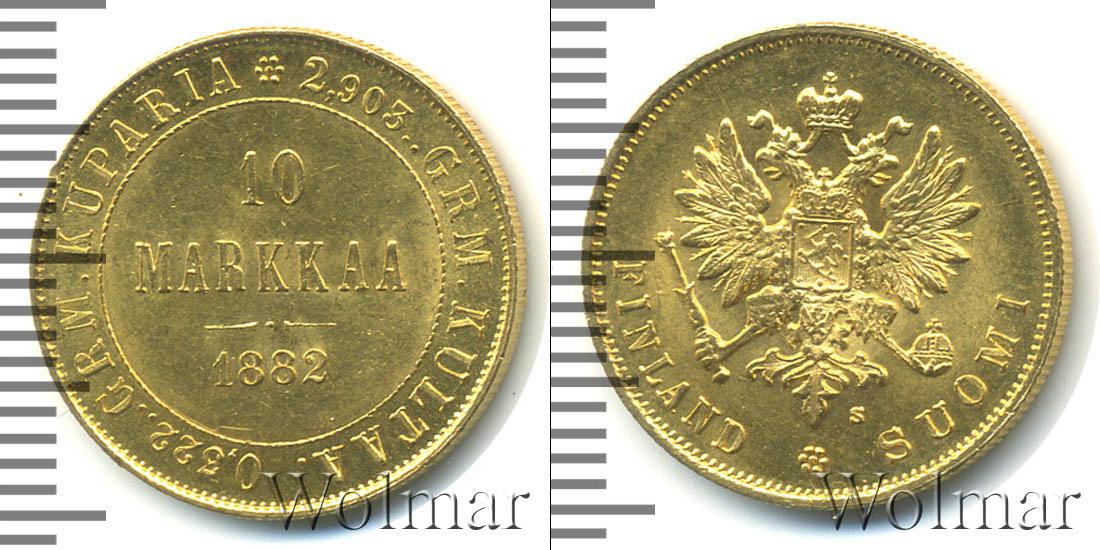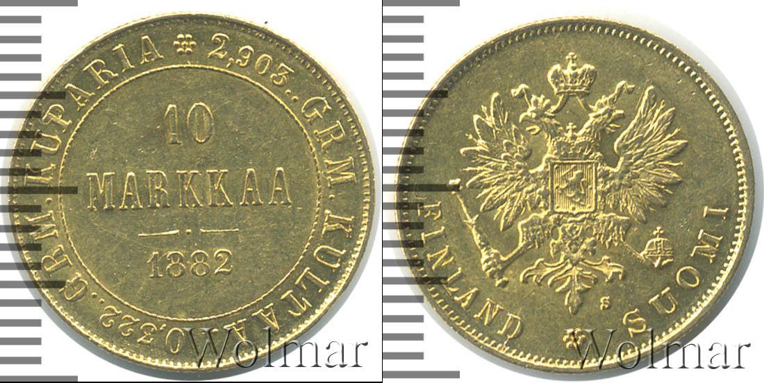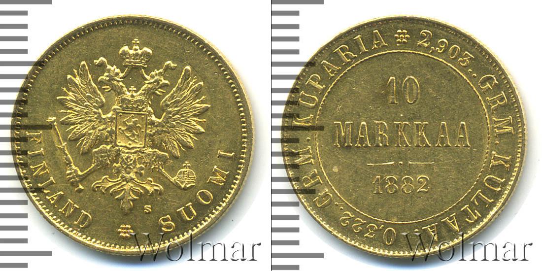 Монета отчеканена из золота. Масса составляет 3,23 г., а диаметр равен – 19,1 мм. Внутри круга в три строки надпись: 10 MARKKAA 1882. Вдоль края монеты расположены две надписи: 2,903..GRM. KULTAA. (содержание золота в изделии) и 0,322..GRM. KUPARIA (содер