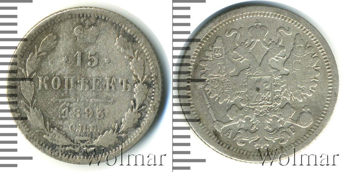 С оборотной стороны показана Малая корона Российской Империи, дубовая и лавровая ветви, а также отмечены номинал, дата эмиссии и монетный двор: 15 КОПЕЕК 1893 С.П.Б. Диск монеты украшают две волнистые линии, зубчатый орнамент вдоль канта.