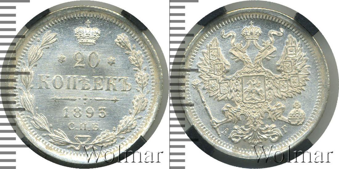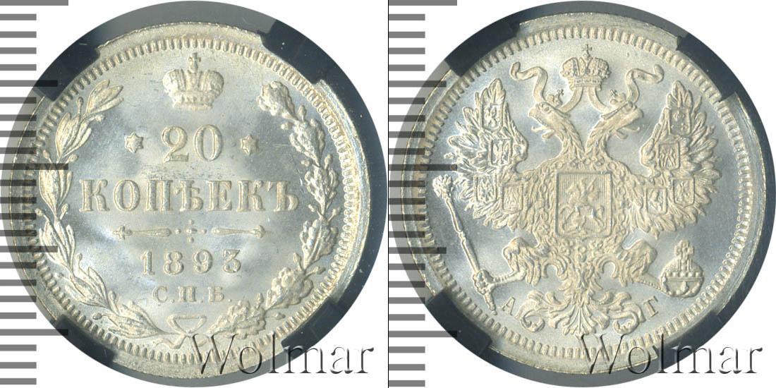 В слабе NGC. Санкт-Петербургский монетный двор. Биткин №# 921.111, тираж 2 500 008, Уздеников №# 2055. По каталогу Wolmar # 124/49. 20 копеек СПБ АГ