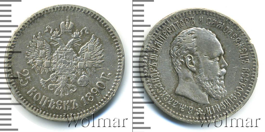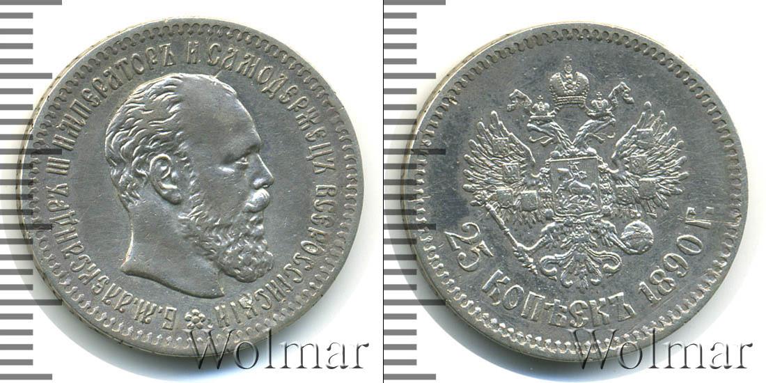 Одна из серебряных монет Александра III. В центре гербовая эмблема России (двуглавый орел со скипетром и державой), а внизу указание на номинал и дату выпуска партии монет: 25 КОПЕЕК 1890 Г. Вдоль канта идет зубчатый орнамент.
